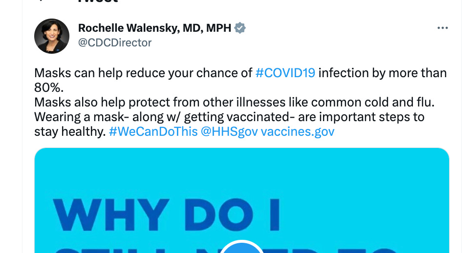 Walensky commissioned zero RCTs of masking. Instead, she made wild claims about how good masking would be, and it applied to other illnesses (both falsehoods)