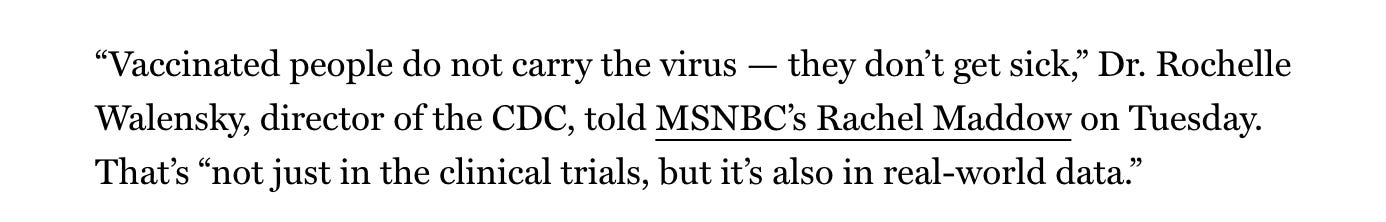 She must have known she did not have data to support the claim. She must have known the trials did not assess it. The better argument against masking was after vaccination, there was no further risk modification, so better to get back to life. Also, masks never had good data. But her claim was strong, bizarre, and ultimately wrong.