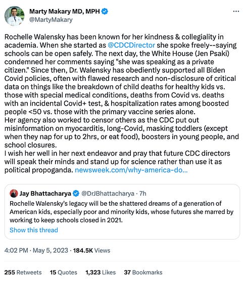 In conclusion, in these 4 domains, Walensky failed. History will remember her as the worst CDC director of all times. I will end on a positive note, which is Marty’s assessment of her performance.