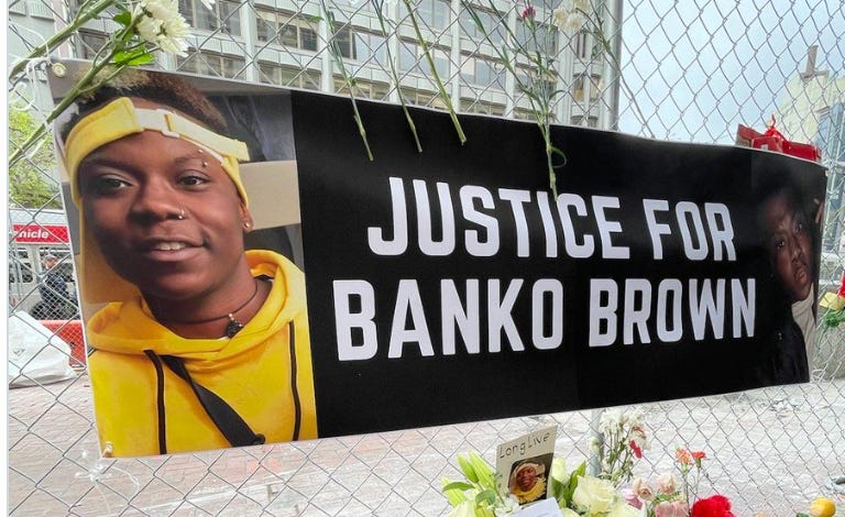 Brown was a homeless “trans man” (a biological woman) of color. Security guard Anthony was briefly arrested for homicide.