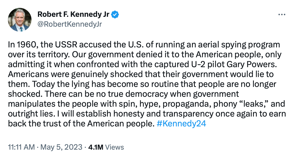 🔥 Robert Kennedy, Jr.’s presidential run sure has some interesting features. Kennedy — a long-time, reliable liberal on nearly every issue except vaccines — is still getting plenty of eyeballs despite being told he will never debate Joe Biden in the democrat primaries. And he’s saying some pretty remarkable anti-big-government stuff that I’m guessing most democrats have not heard too often before:
