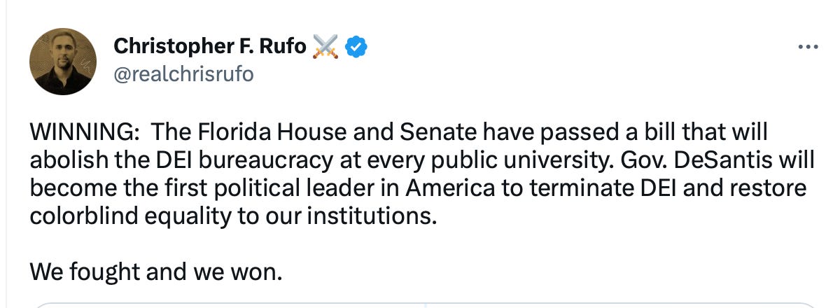 🔥 Anti-CRT expert Chris Rufo seemed pleased with Florida’s recent legislative session, pointing out another one that yesterday’s list omitted: higher education laws to help shed odious DEI programming: