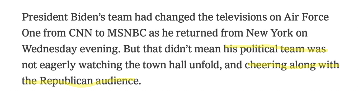 Ultimately, the Times essentially assured its fretful readers not to worry, the CNN interview was all part of Biden campaign’s plan, even reporting that Biden’s political team was “cheering along with the Republican audience”: