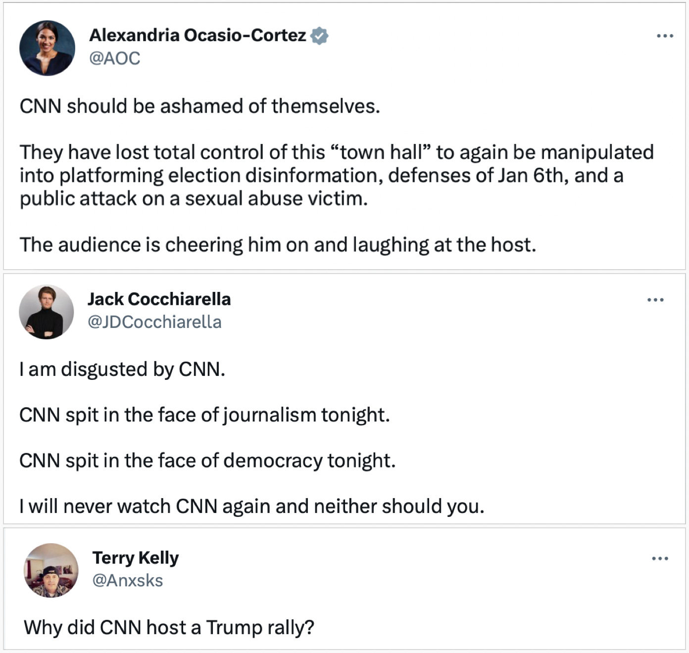 📈 Trump appeared on a CNN “Voter Town Hall” last night and did the impossible: gave liberals something even more horrifying to consider than the idea of Tucker moving to Twitter. Anguished liberals wept over CNN’s downfall, and angrily accused the reliably woke network of literally spitting in Democracy’s face.