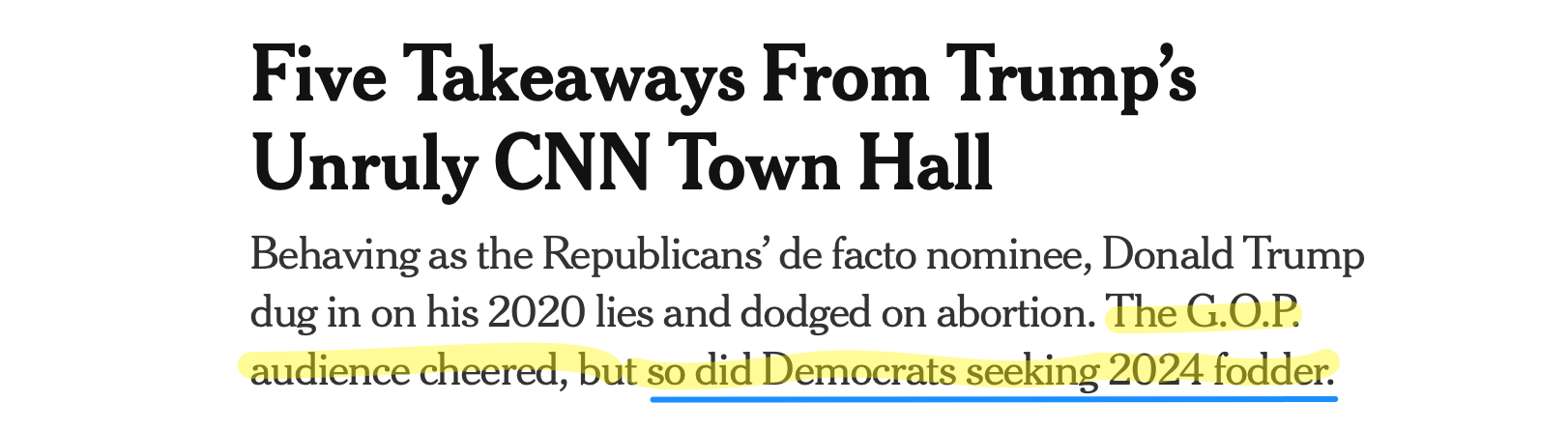 They aren’t even making a big secret about it. The New York Times’ article on Trump’s CNN appearance featured a sub-headline that implicitly made the point that the CNN town hall actually helped democrats: