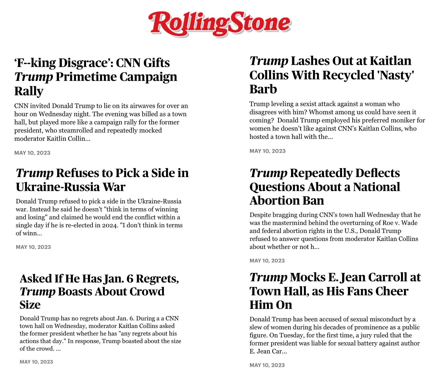 Rolling Stone was so triggered that nearly every one of its reporters scribbled jeremiads of outrage following the town hall — long after working hours and before they went to bed late last night — presumably to inform Rolling Stone’s midnight readers or maybe just to get it out of their systems: