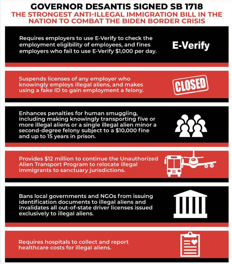 DeSantis signed SB 1718, which among other things criminalizes bringing illegal immigrants into Florida, bans issuance of drivers’ licenses or ID cards to illegals, and provides $12 million to ship the migrants to blue states and sanctuary cities. This bill isn’t a hot take. In order to be signed into law this week, the bill was on the Governor’s radar since last fall.