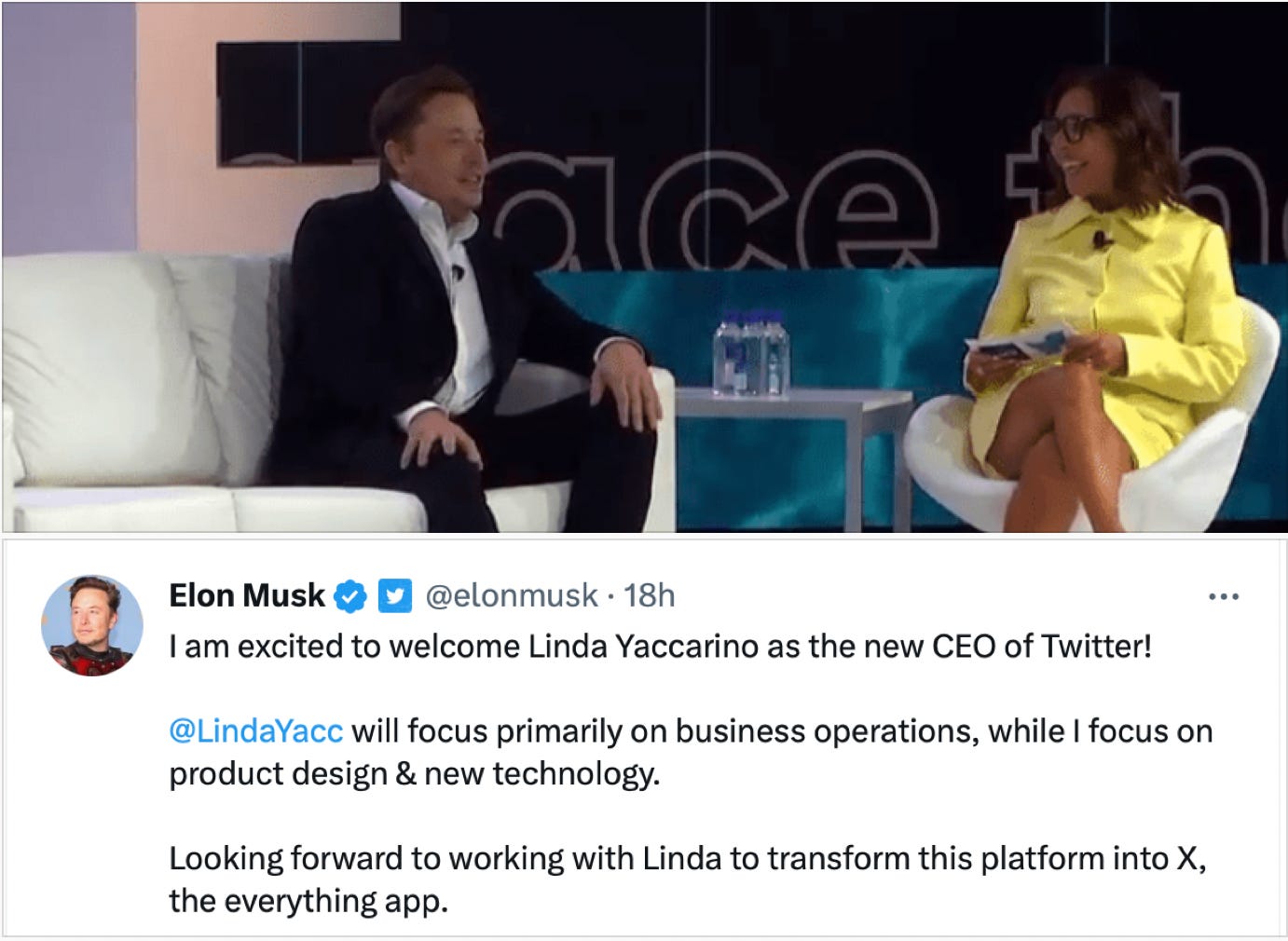 🔥 Yesterday, Elon Musk officially announced NBC Universal’s streaming media executive Linda Yaccarino as Twitter’s new CEO, and a lot of people are freaking out. It only took about five seconds for independent investigators to discover Yaccarino is a skilled virtue-signaler (pronouns), and chairs a World Economic Forum woke sub-committee of some kind.