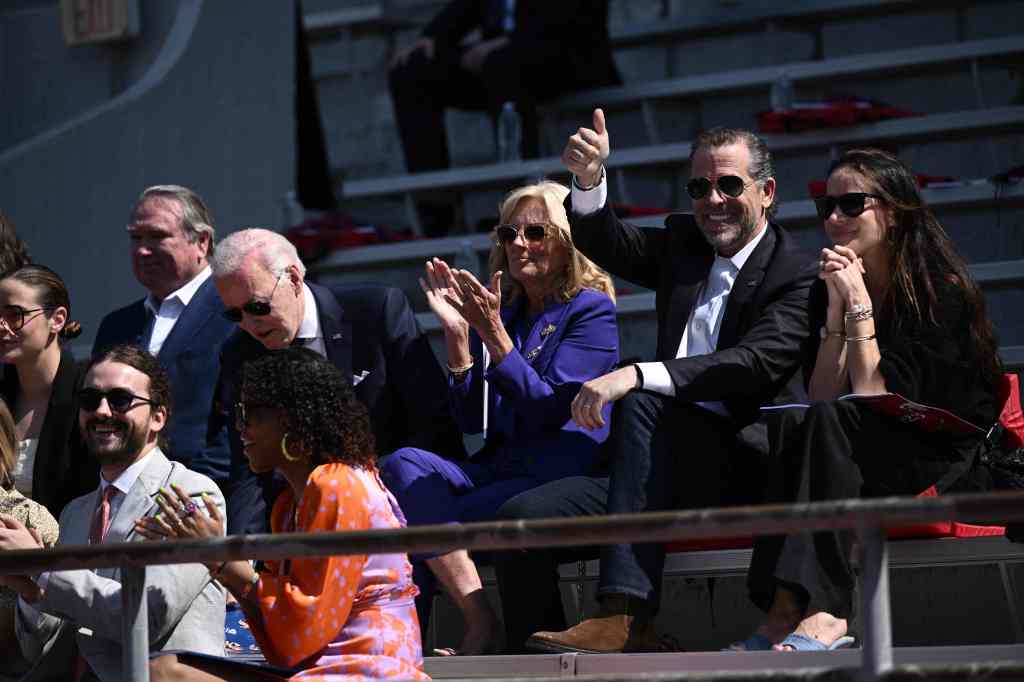 He was in good spirits Monday and gave journalists a thumbs-up while seated near his dad, President Biden, at the graduation ceremony for his daughter Maisy from the University of Pennsylvania.