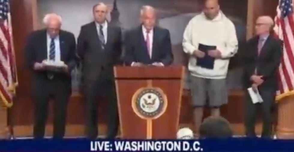 Along those lines, Fetterman was back in gym shorts and a hoody yesterday, while all the other politicians were wearing suits and acting like everything was perfectly normal; he’s just doing the best he can, bless his heart: