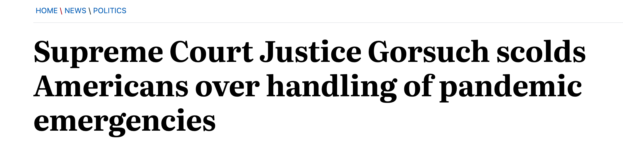That’s not Constitutional. If outsized executive authority was already a problem before the pandemic, then the pandemic turned the problem hypersonic. Gorsuch’s statement laid bare the problem.