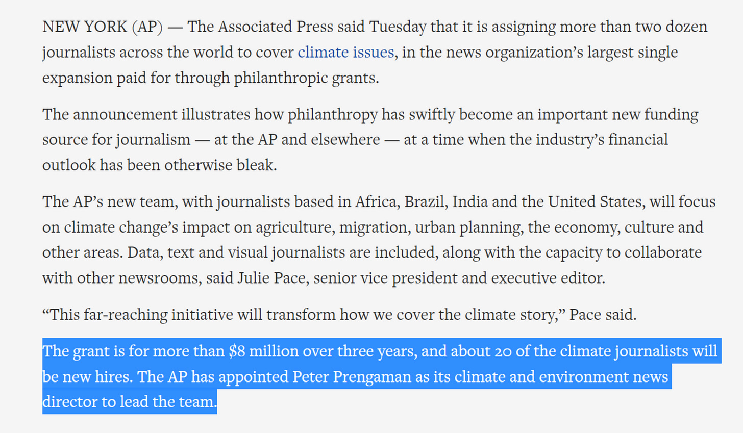 climate activists pumped $8 million into AP and got a couple dozen new reporters led by peter prengaman who rapidly amassed a team of climate zealots to engage in one sided reporting on this topic.
