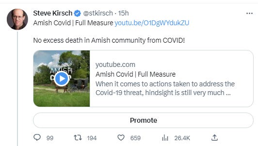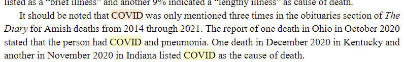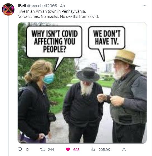 People who live in Amish communities: No vaccines, No masks. No deaths. Nobody could name 5 Amish who died from COVID in Lancaster, PA which is the largest Amish community in the US. Whoops! I offered $2,500 and all I got was excuses on why they couldn’t give me a single name of anyone who died.
