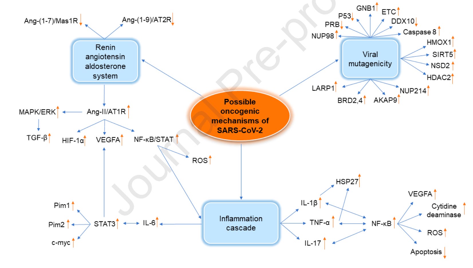 [1: RAAS Dysregulation.] In SARS-CoV-2 infection, the virus binds to ACE2 and … downregulates AT1R, which leads to dysregulation of the RAAS* system[, which] leads to inflammation, vasoconstriction, fibrosis, oxidation, and capillary permeability which can all be a factor in triggering cancer progression and development[.]