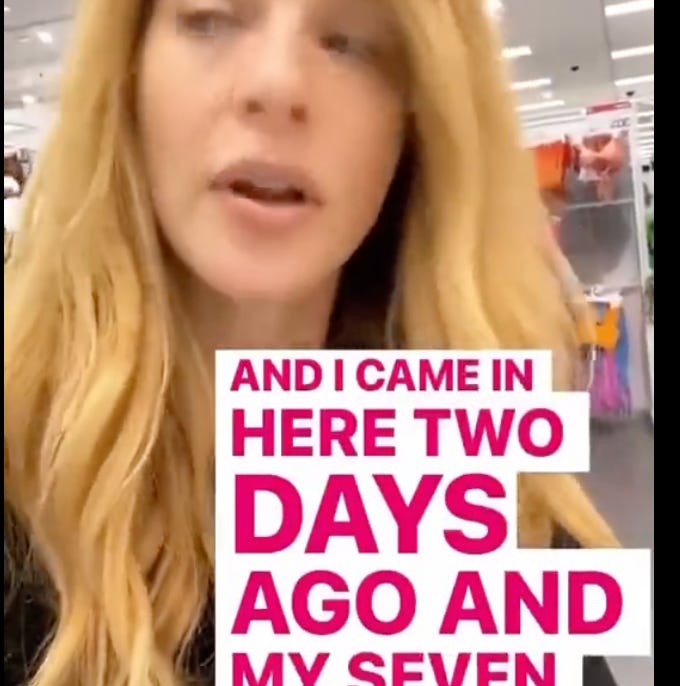 — Lafevre tearfully said her son can’t – CAN’T — go to Target unless the Target Pride displays are put back, or else his little feelings will be so hurt, so much, that … who knows what he’ll do to himself. I guess she’ll have to shop at Walmart in the meantime.