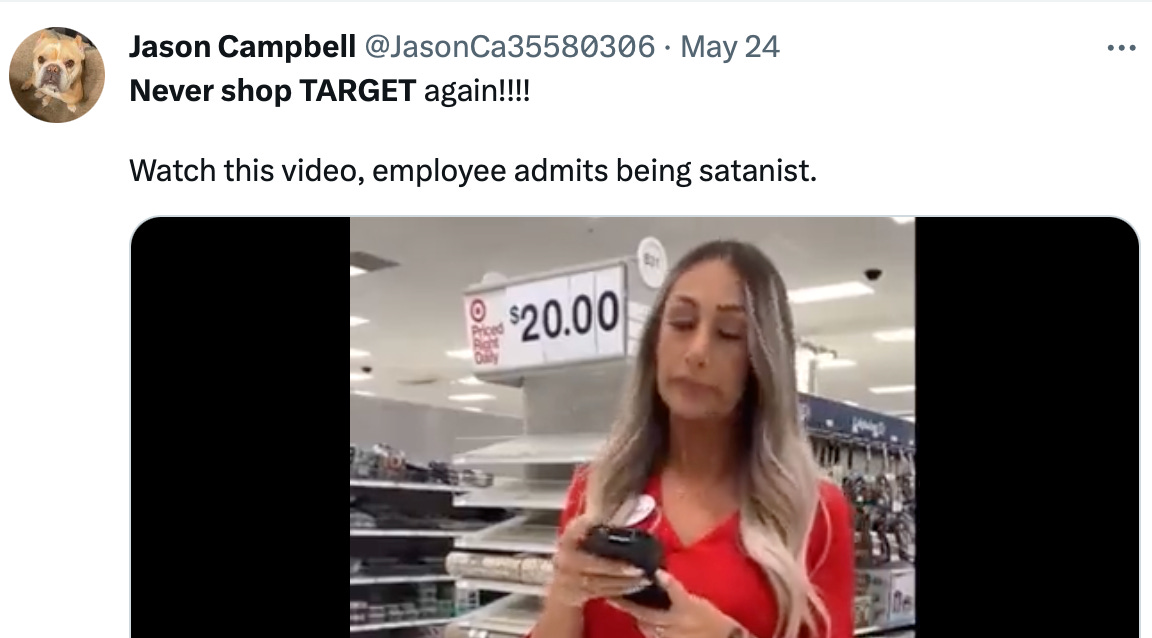 Anyway, back to the Target story. Courageous citizens are getting creative about piling onto Target’s public relations disaster. There were too many to describe them all. In this representative example, a nettlesome conservative asks the Target employee whether she’s a Satanist, and she admits that she is, because she doesn’t believe in God: