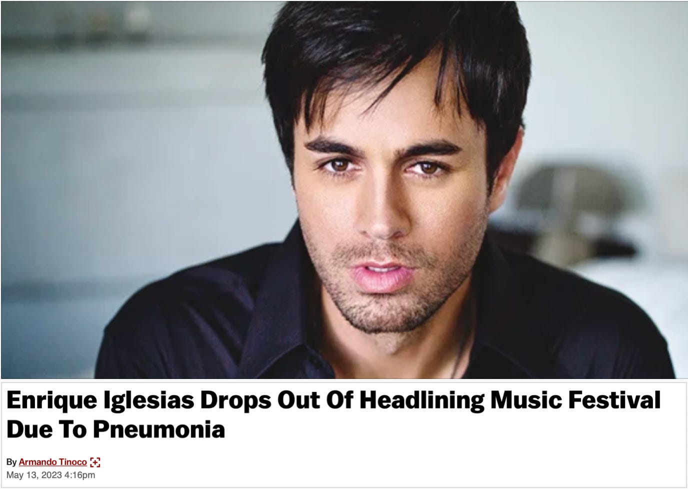 💉 Muy guapo Spanish singer and heartthrob Enrique Iglesias, 48, broke fans’ hearts by cancelling a music festival appearance, after suddenly and unexpectedly “contracting pneumonia.”