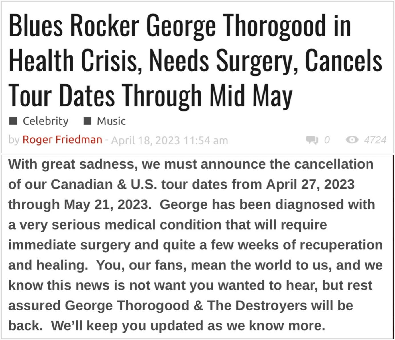 💉 “Bad to the Bone” star George Thorogood, 73, canceled his current tour due to a sudden and unexpected, “very serious medical condition.” No new information has been released about George’s condition since this April announcement: