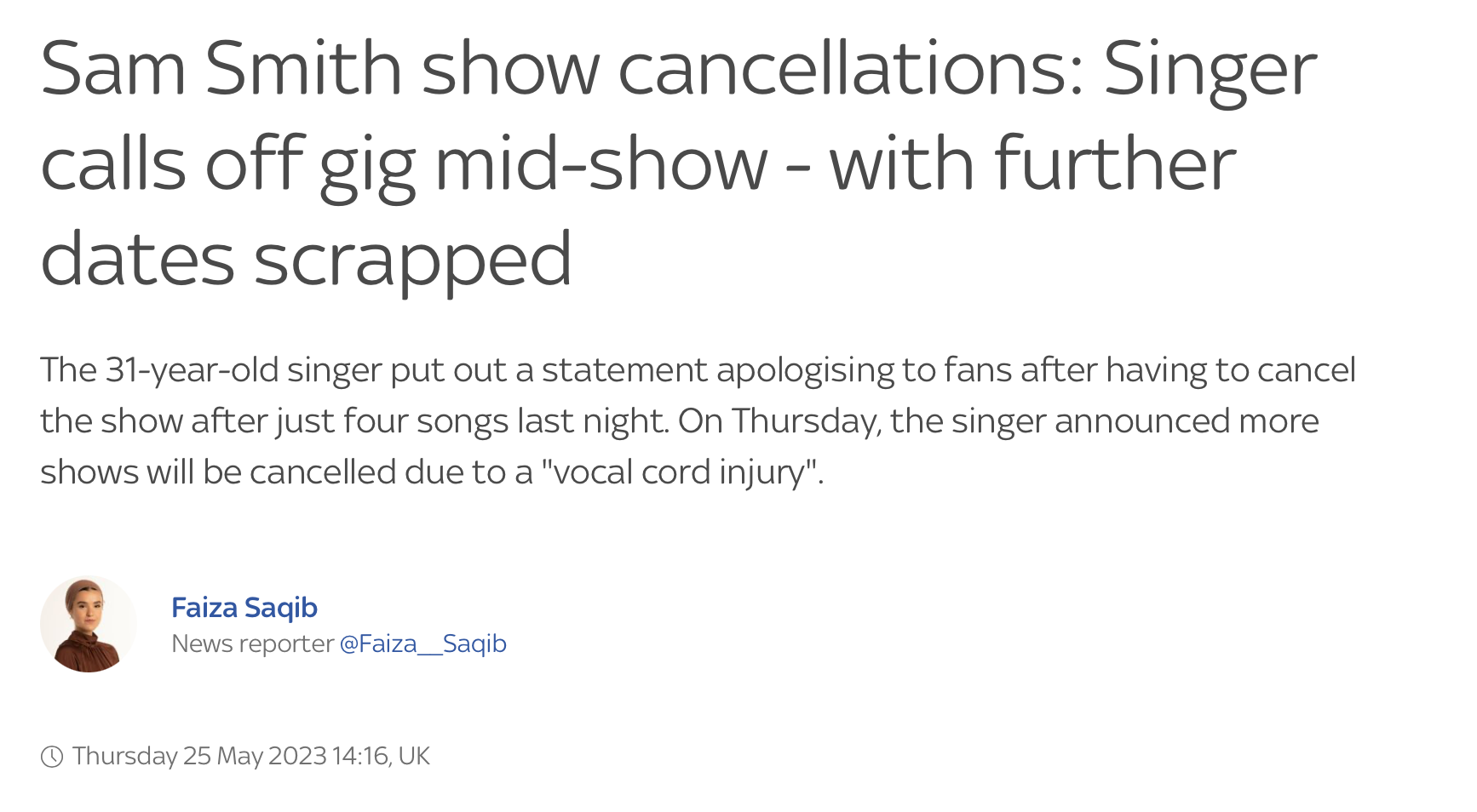 💉 Sam Smith, 31, abruptly ended a recent concert, citing a mysterious “vocal cord injury” that came on suddenly and unexpectedly mid-concert.
