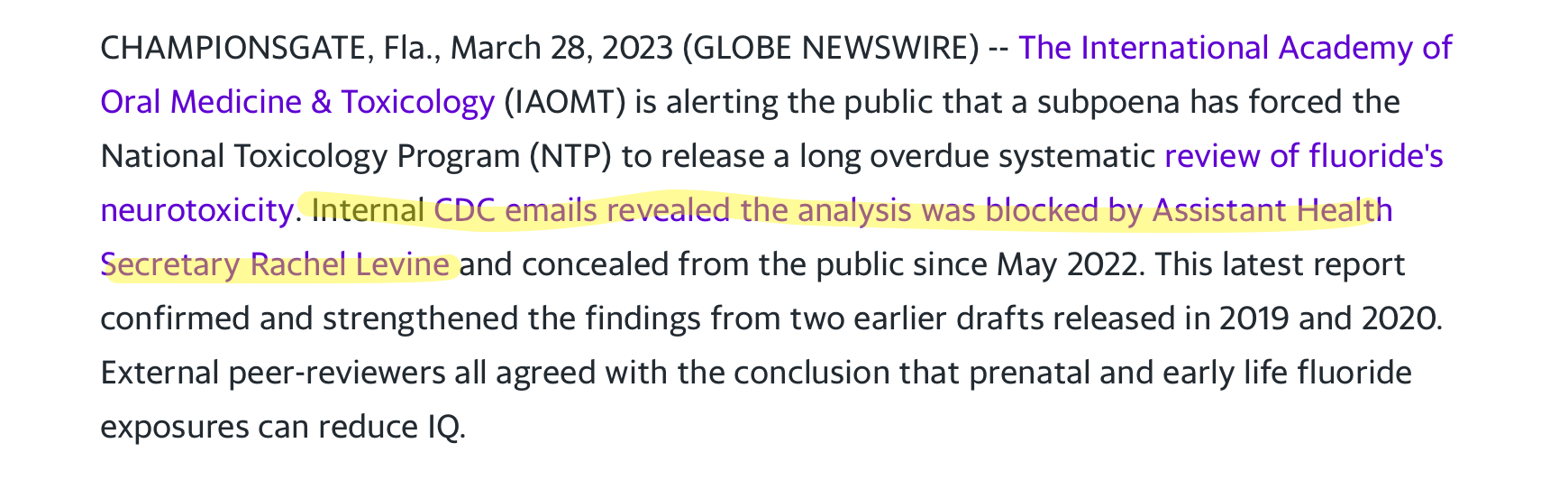 I’m sure you’ll be shocked to learn that internal CDC emails obtained through FOIA show the so-called health agency working behind the scenes to undermine any studies finding harmful effects of fluoridation. In fact, the most significant interference came from none other than unattractive cross-dresser “Rachel” Levine.