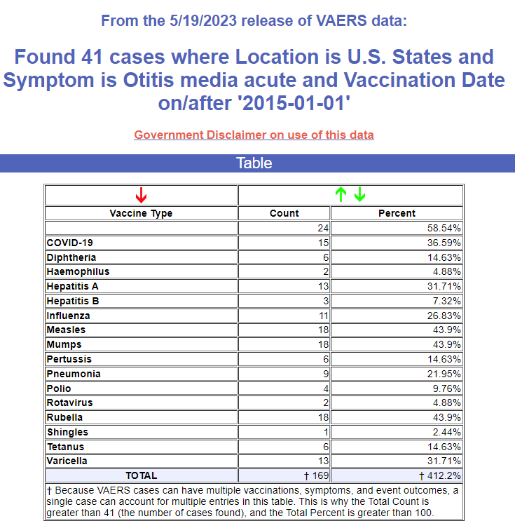 Here the counts for ear infections are only slightly elevated in the COVID vaccine (15) vs. the flu vaccine (11). While it might be true that flu and COVID are elevating ear infections, that would require more investigation. The important thing here is the # of reports are comparable for flu and COVID for this symptom which we think is not elevated by vaccines.