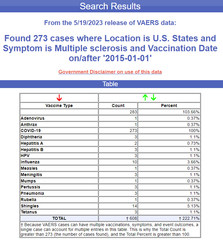 Here there are 28X more cases of MS for the COVID shot compared to the flu shot. That’s a problem. That doesn’t happen by chance; the absolute counts are too big (it’s a 16-sigma rise). See the section on ear infections and you’ll see what the VAERS counts look like for an event that is unrelated to vaccines.