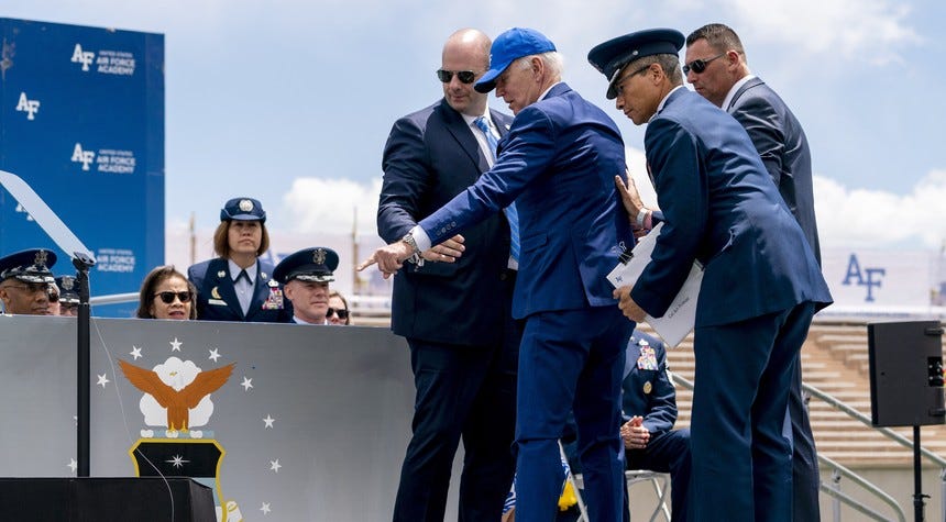 But really, this appalling spectacle isn’t about Joe Biden at all. It isn’t about whether he’s broken his hip, or is about to, or even whether he is an abused elder in need of rescue. The point is, Biden — sadly — is the apparent leader of our Nation.