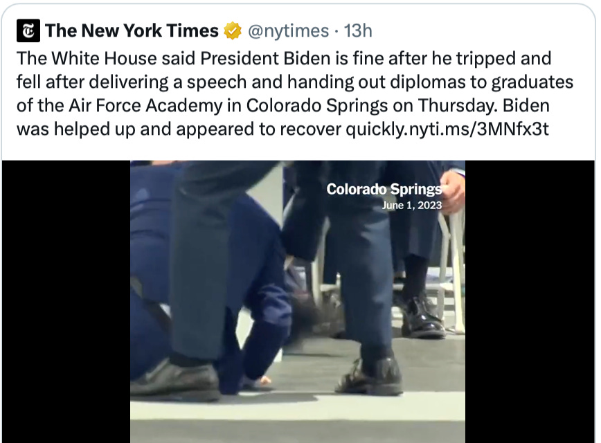🔥 To round out your morning, here is a fuller Biden Fall clip, with a sort of amusing narration, that will either make you laugh or cry, or maybe both at the same time.