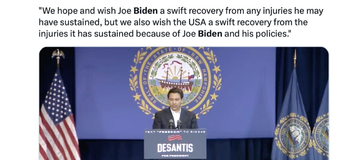 Yesterday, Governor DeSantis promptly and graciously wished Joe Biden (note: DeSantis didn’t use the ‘P’ word) a “swift recovery” from his fall, and also wished America a swift recovery from Joe Biden:
