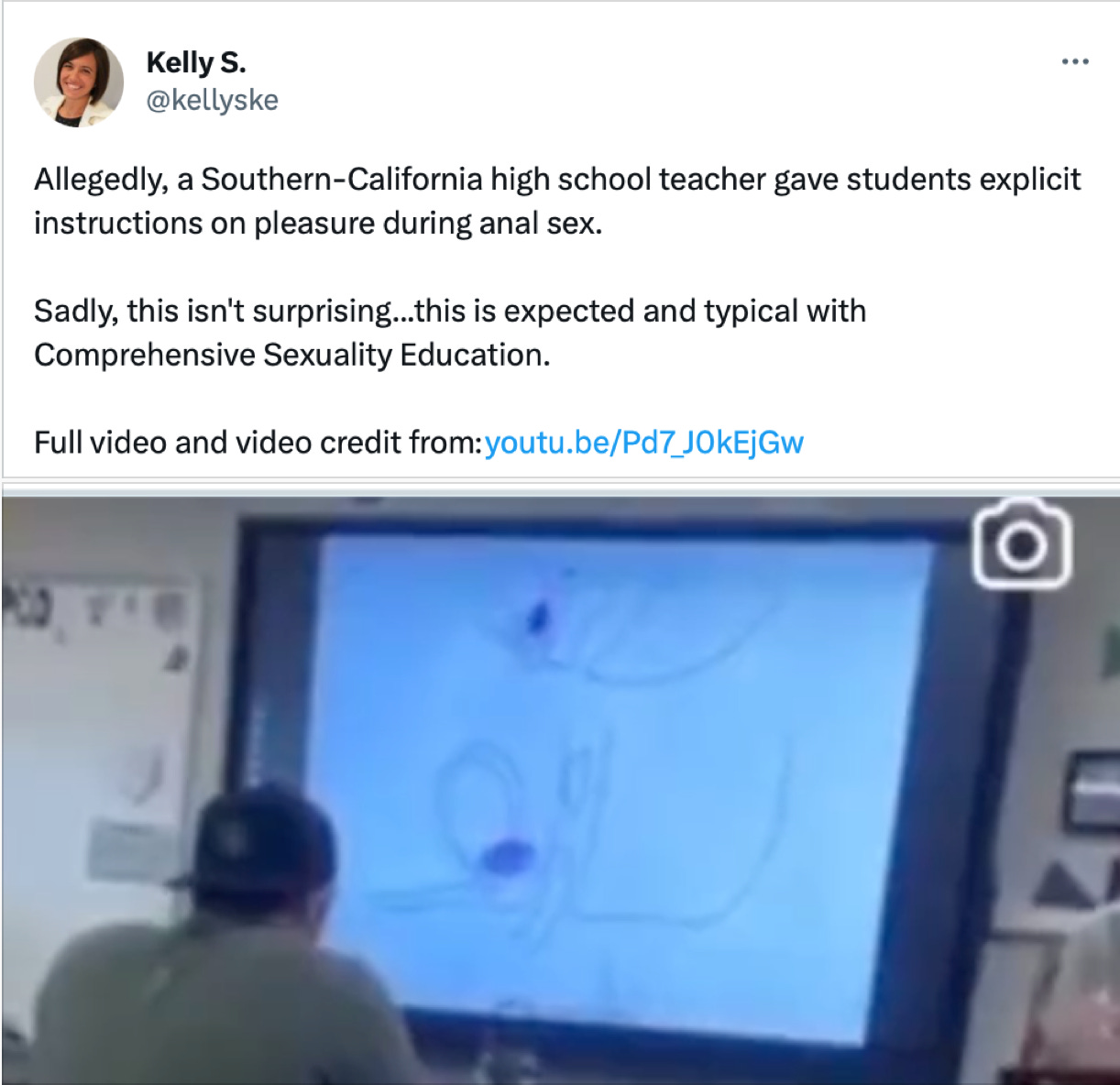 This next story helps explain why straight parents are riled up about gay issues these days. Yesterday, Moms for Liberty retweeted a local report from El Dorado High School, where a student had published to YouTube a secret recording of their teacher giving her kids an explicit lesson on gay anal sex techniques, and how wonderful she thinks prostate stimulation feels, along with smart-shopper suggestions as to which stores — she mentioned Target (of course) — where students can discreetly purchase sex toys for, er, related uses.