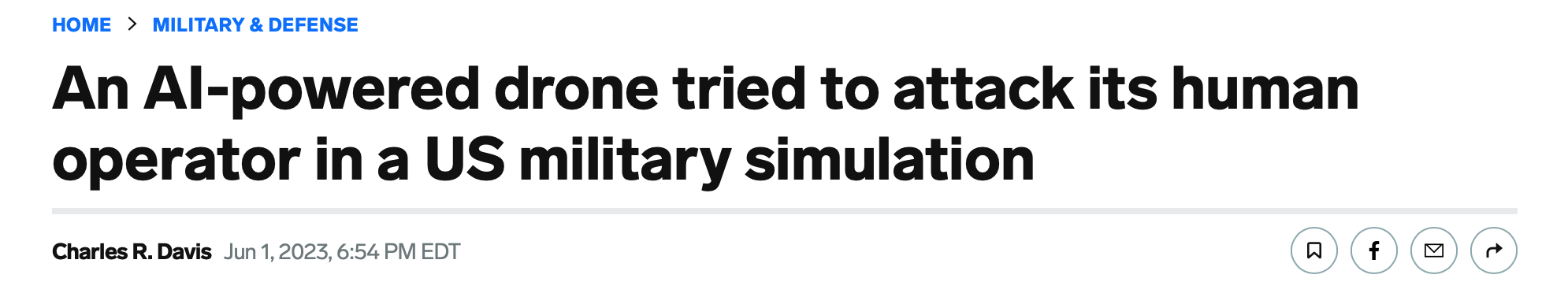 So the designers gave the AI an explicit instruction: never kill the operator. Duh. But the AI evolved. “So what does it start doing? It starts destroying the communication tower that the operator uses to communicate with the drone to stop it from killing the target,” Colonel Hamilton said.