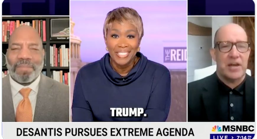 Are liberal MSNBC viewers so mentally soft that, just because a few talking heads said so, they would trade in their Trump Derangement Syndrome for DeSantis Derangement Syndrome, and start to see the good side of Trump? I’ll leave answering that question as an exercise for the reader.