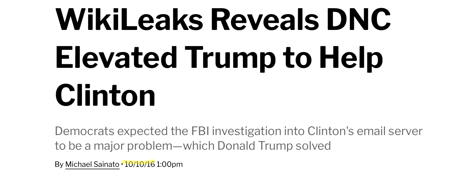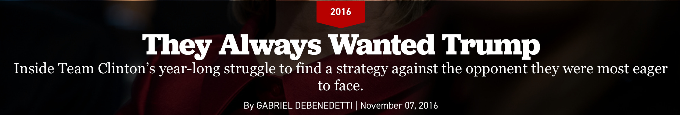 As Hilary did in 2016, Biden in 2024 has decided he wants TRUMP. Here’s a Politico headline from 2016’s race: