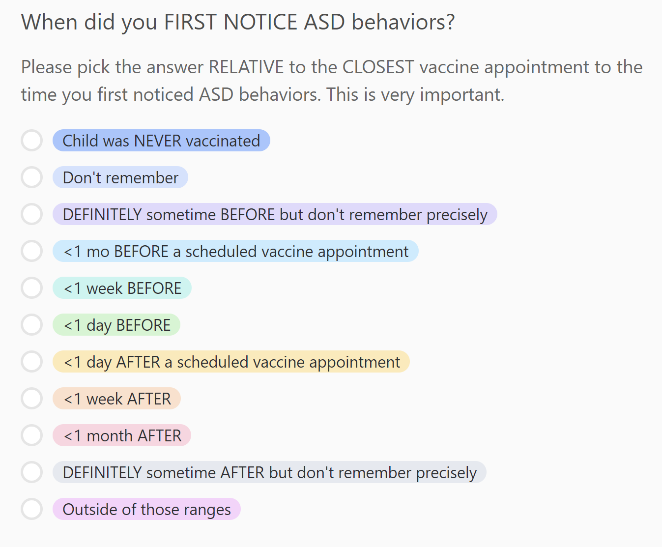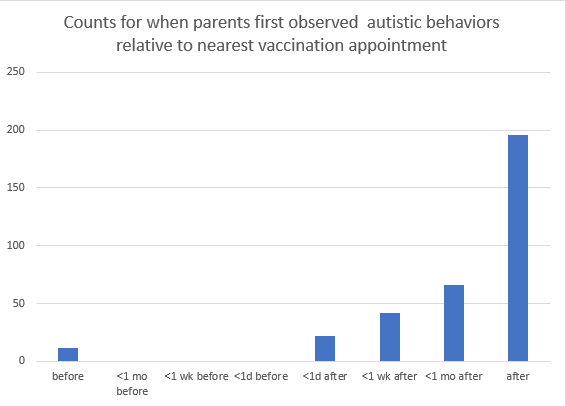 If vaccines aren’t triggering autism, then the number of times a parent notices autistic behaviors BEFORE a wellness visit where a vaccine is given should be comparable to the number of times AFTER the visit.