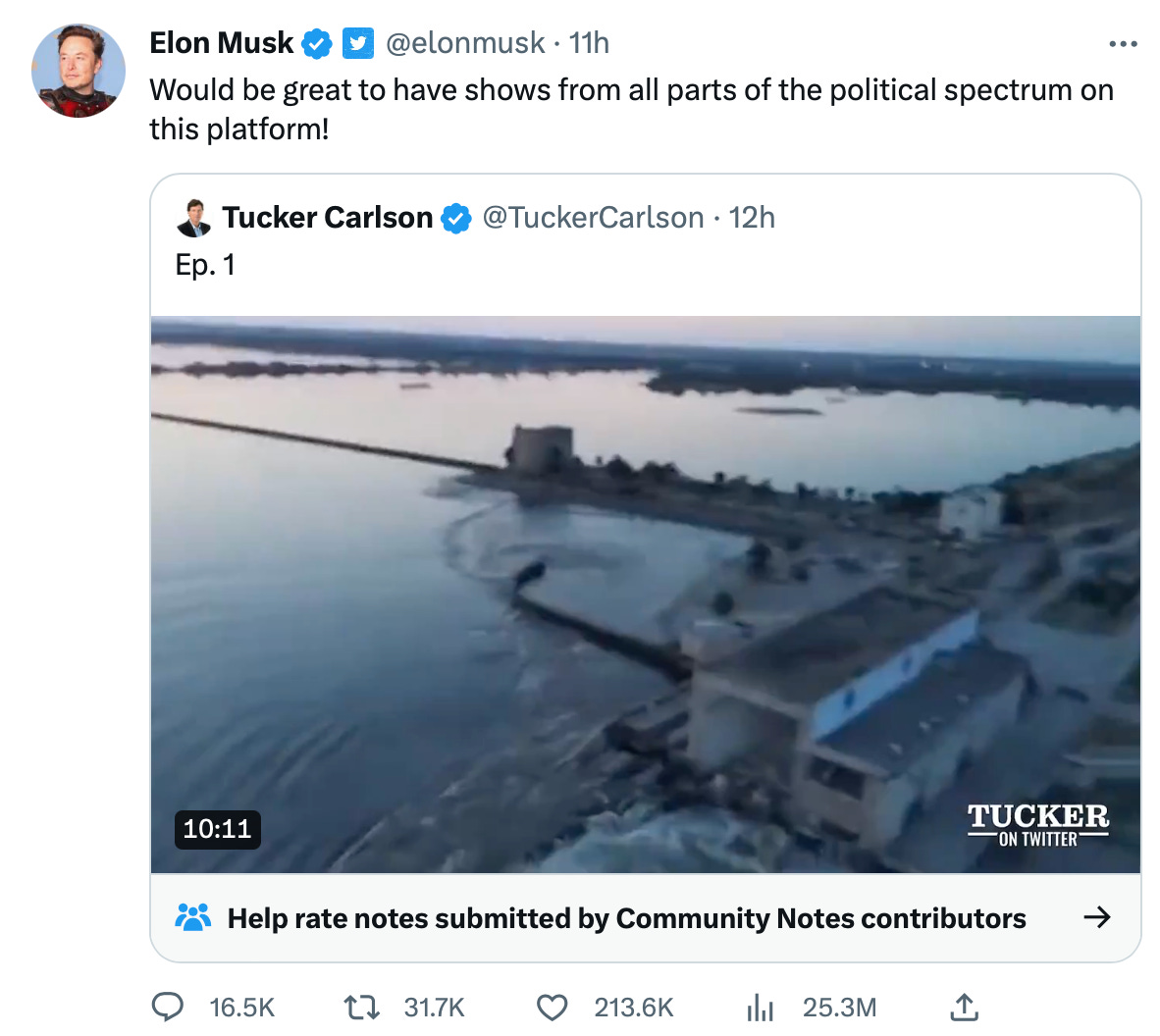 🪖 The first episode of Tucker’s new internet show, “Tucker on Twitter,” aired yesterday (10 minutes), and began with the Kakhovka dam story. Elon Musk promoted the new episode, garnering over 25 million tweet views in just the first 11 hours.
