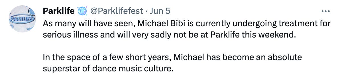 💉 BBC News ran a story yesterday headlined, “Michael Bibi: Dance Music DJ Diagnosed With Rare Cancer.” The good news is it’s moving slowly though, so … oh wait.