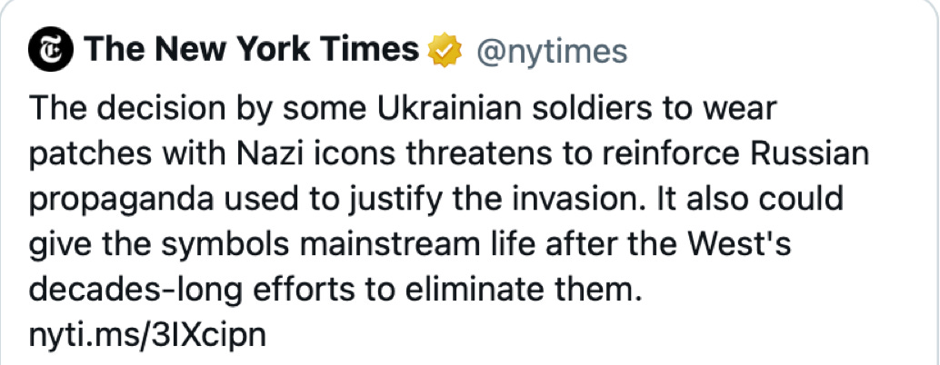 🔥 It’s getting hard to keep up with them all. A second, now-confirmed conspiracy fact appeared in the New York Times Monday, in a wild article headlined “Nazi Symbols on Ukraine’s Front Lines Highlight Thorny Issues of History.”