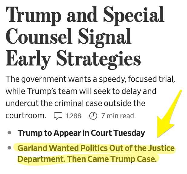 They think they’re readers are morons. Grandma Garland wanted politics out of the DOJ? Really? And now the fact the DOJ is politicized is … Trump’s fault? And, notice how the main story’s subheader praised “the government,” which only wants a “speedy, focused trial,” while criticizing Trump and this team, who are just delayers and undercutters.
