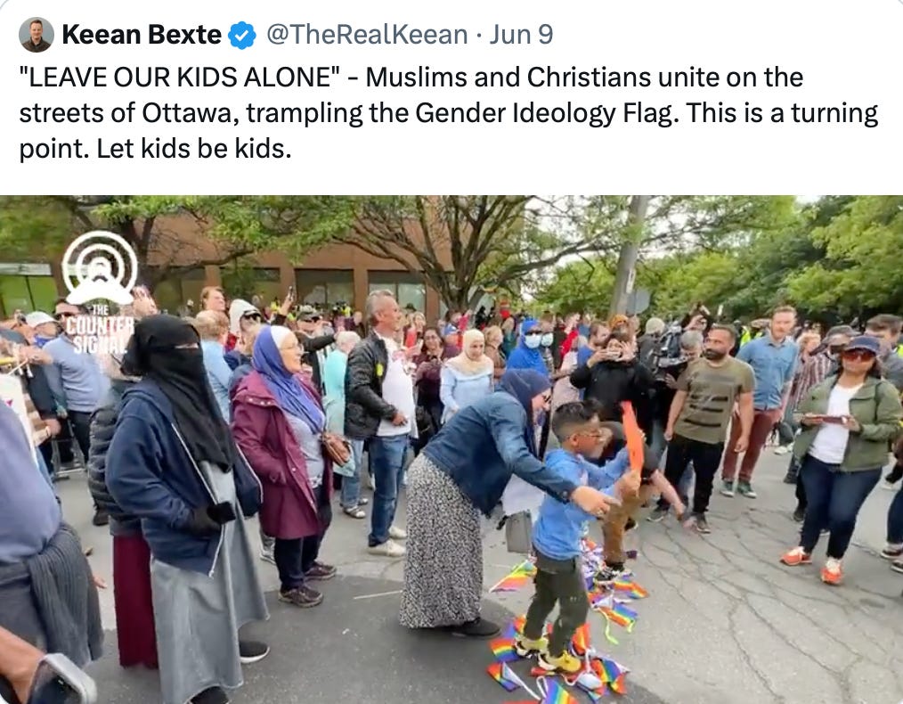 🔥 The Post Millennial ran an intriguing story this weekend headlined, “BREAKING: Children stomp on Pride flags as Christian and Muslim parents protest LGBTQ indoctrination in Ottawa schools.”
