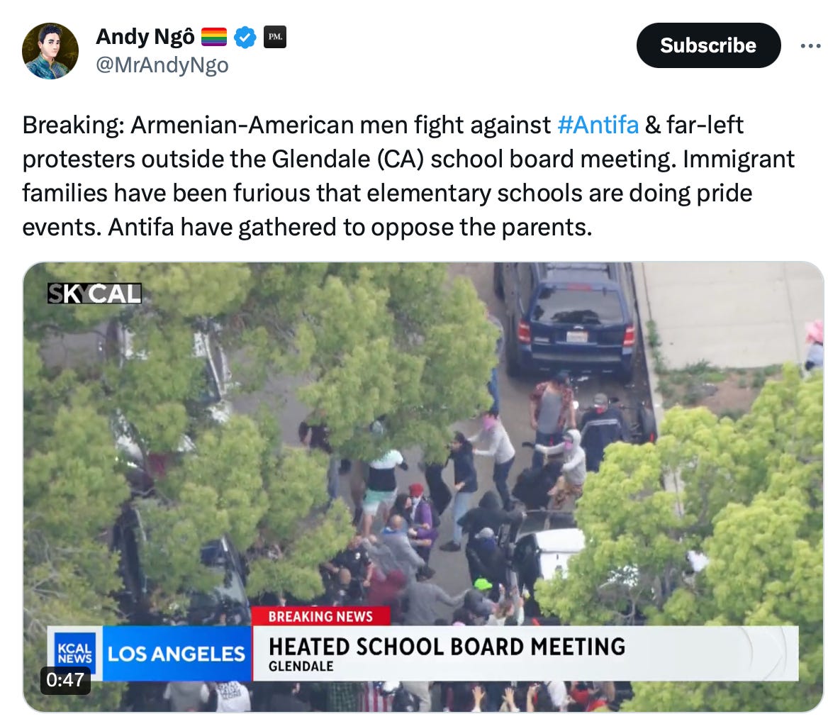 🔥 In related news, California Muslim parents protesting Pride last week were assaulted by Antifa goons in a sneak attack. But the parents — mostly recent Armenian immigrants — weren’t having it, and by all accounts gave the tattooed wonders a thrashing they won’t soon forget.
