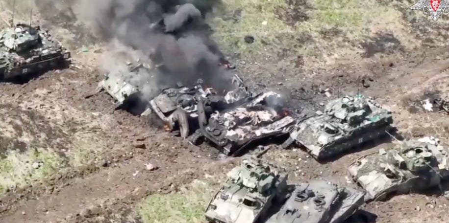🚀 Despite a gaping black hole of reliable corporate media war news on the Spring Counteroffensive™, the established independent reporters all suggest the Russians have been capturing scores of abandoned, high-tech U.S-made Bradley fighting vehicles and advanced German Leopard tanks, sometimes even with the engines still running.