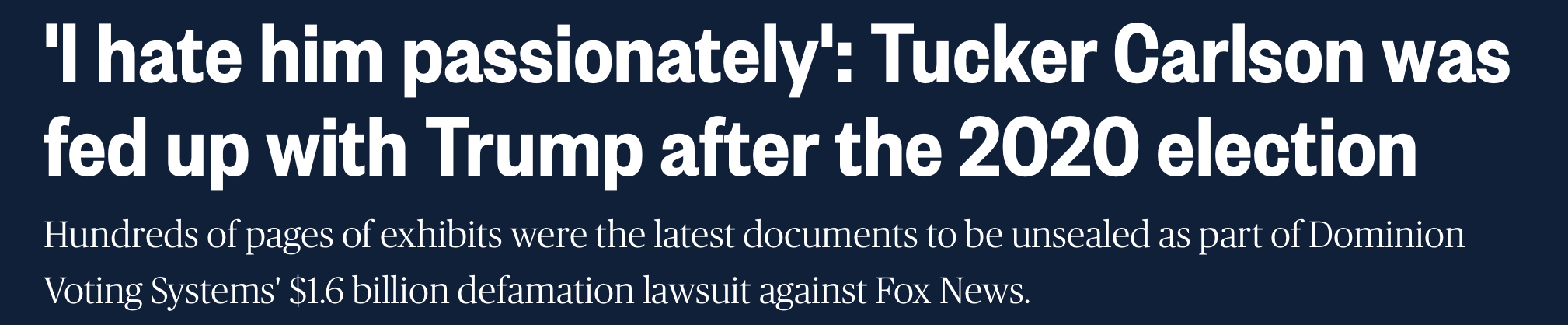 (Note: Interpreting others’ emails is part of what I do for a living, so believe me that drawing any firm conclusions from a single out-of-context text message or email is pure fiction. Lawyers and reporters love to do it, of course, and can cherry-pick just about any desired narrative. For example, when Tucker texted “I hate him”, it might have just been a momentary annoyance at Trump over a missed political opportunity or something, and Tucker was just venting. Or maybe he actually did hate Trump. The point is, I don’t know, neither do you; nobody except Tucker does.)