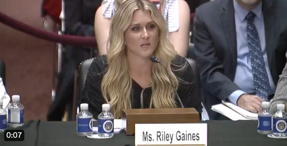 🔥 Swimming champion, former trans-napping victim, heroine, and outspoken biological-women’s rights advocate Riley Gaines testified in Congress yesterday about women’s sports. After the pro-trans witness claimed that no man has ever beaten Serena Williams in tennis,” Ms. Gaines promptly corrected the record.