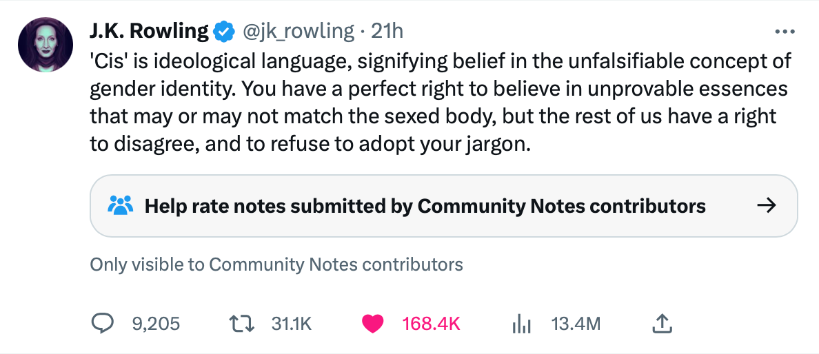🔥 The debate over the insulting nature of the terms “cis” and “cisgender” continued building steam yesterday on Twitter. One good example was Harry Potter author and well-known feminist JK Rowling, who chimed in, calling the theory of gender identity an “unprovable essence”: