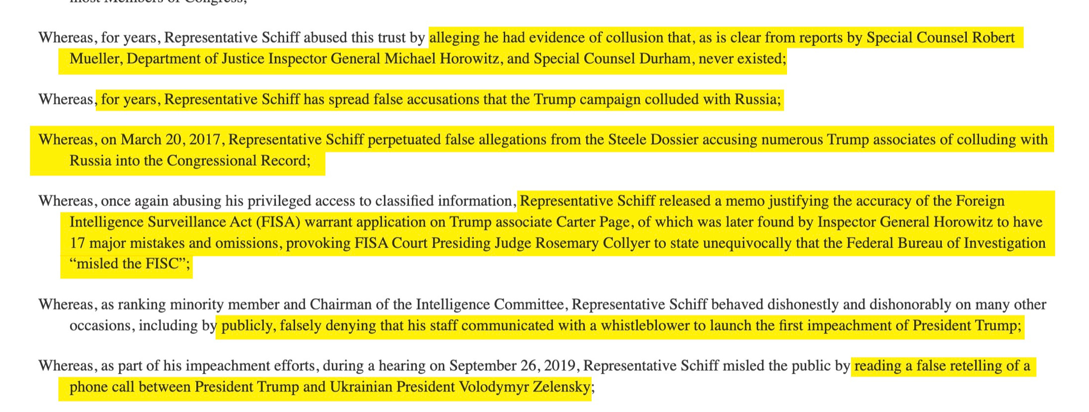 Here are the specific charges against Representative Schiff, from the Censure Resolution: