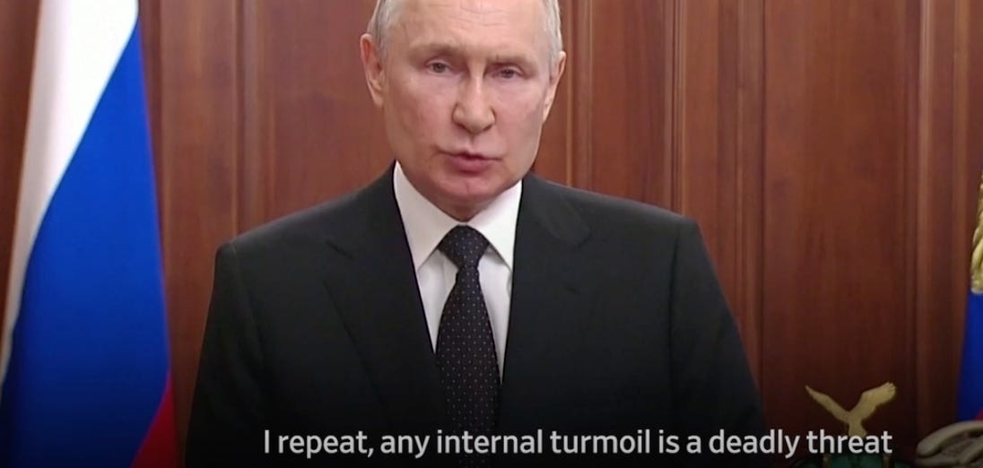 The sub-headline explained, “President intervenes after Yevgeny Prigozhin’s paramilitary group seizes city of Rostov in most serious challenge to Putin since he took power.”