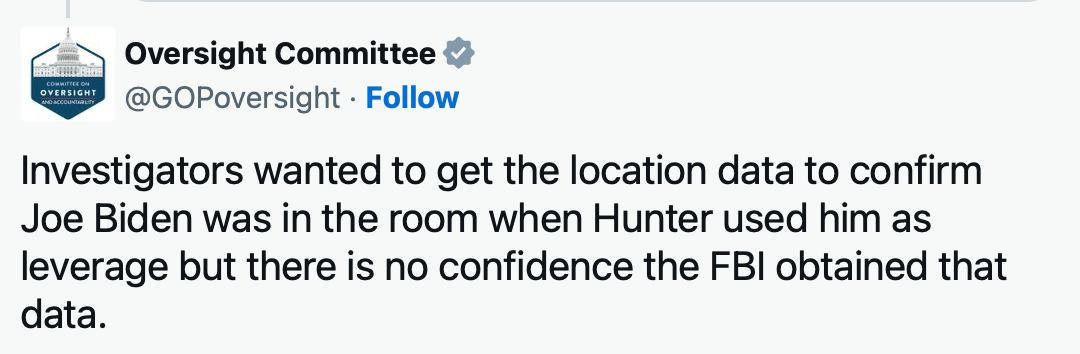 The IRS whistleblower who has been cooperating with the House said that FBI investigators sought to use location data to confirm that Joe Biden was in the room, but their investigation was shut down or otherwise buried under the Potomac river.