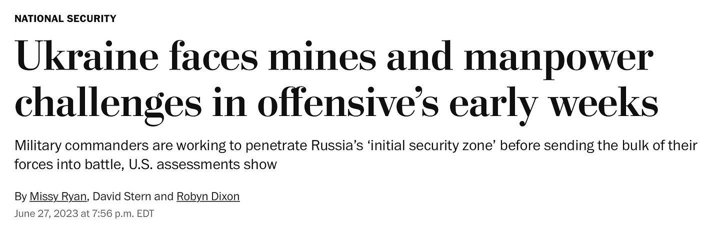 🚀 Lost in all the fake news about the Wagner Civil War, the Evening Standard ran a story late last week headlined, “Ukraine May Be ‘Pausing Counteroffensive’, Says Institute for the Study of War.”