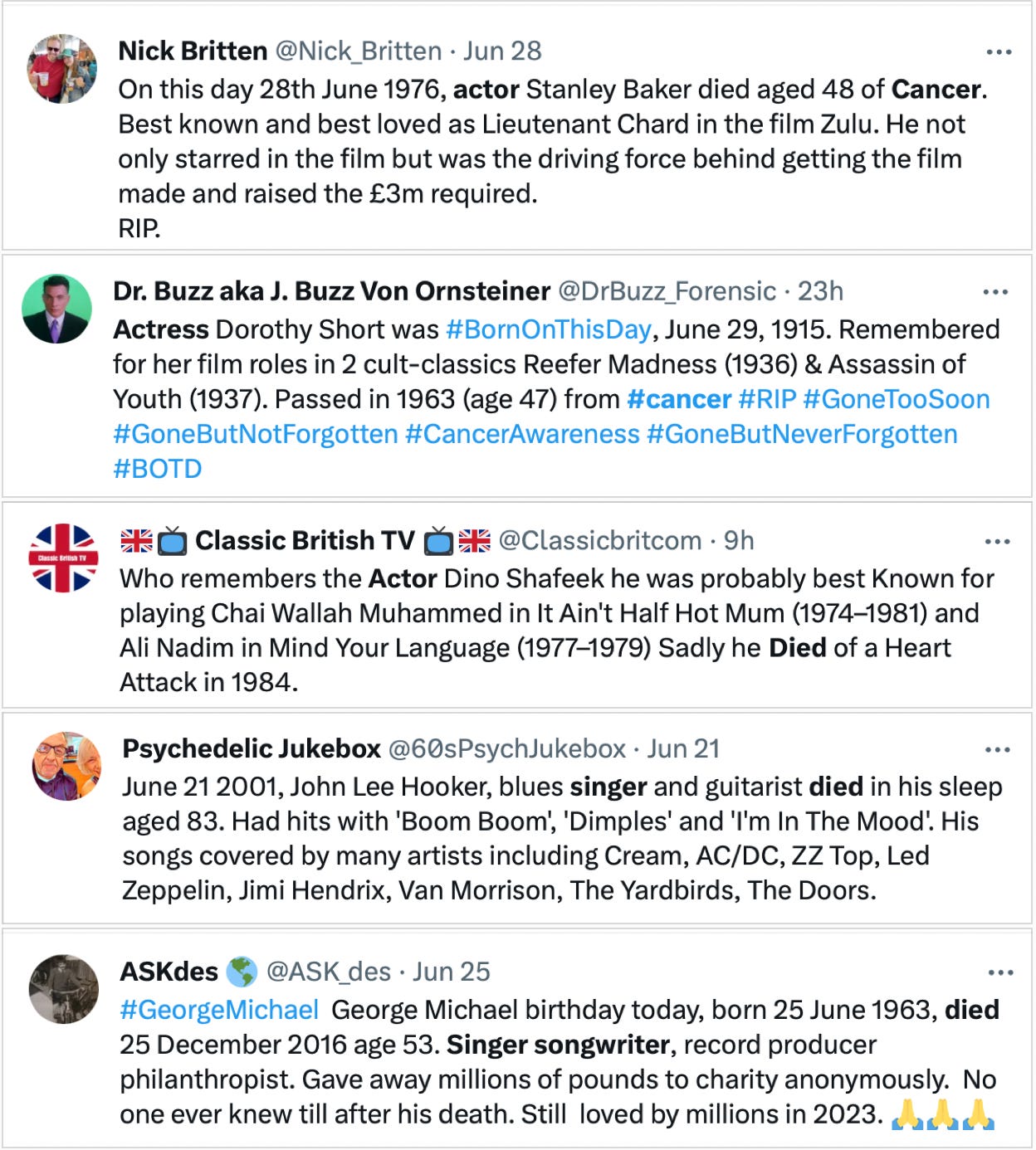💉 In my daily research of mysterious, sudden celebrity deaths, I have noticed a new psyop. Lots of pro-jab accounts have suddenly started reporting historical celebrity deaths and cancers in a common template, using the ridiculous “on this day in history” prop.