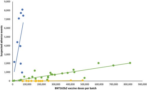 2) The data also suggests the regulators didn’t fail at their job of eliminating the most dangerous batches. They must have seen it in the data. The giveaway is how few of the death batch jabs were injected into patients — since the “deaths shots” group included fewer than 5% of all injections.